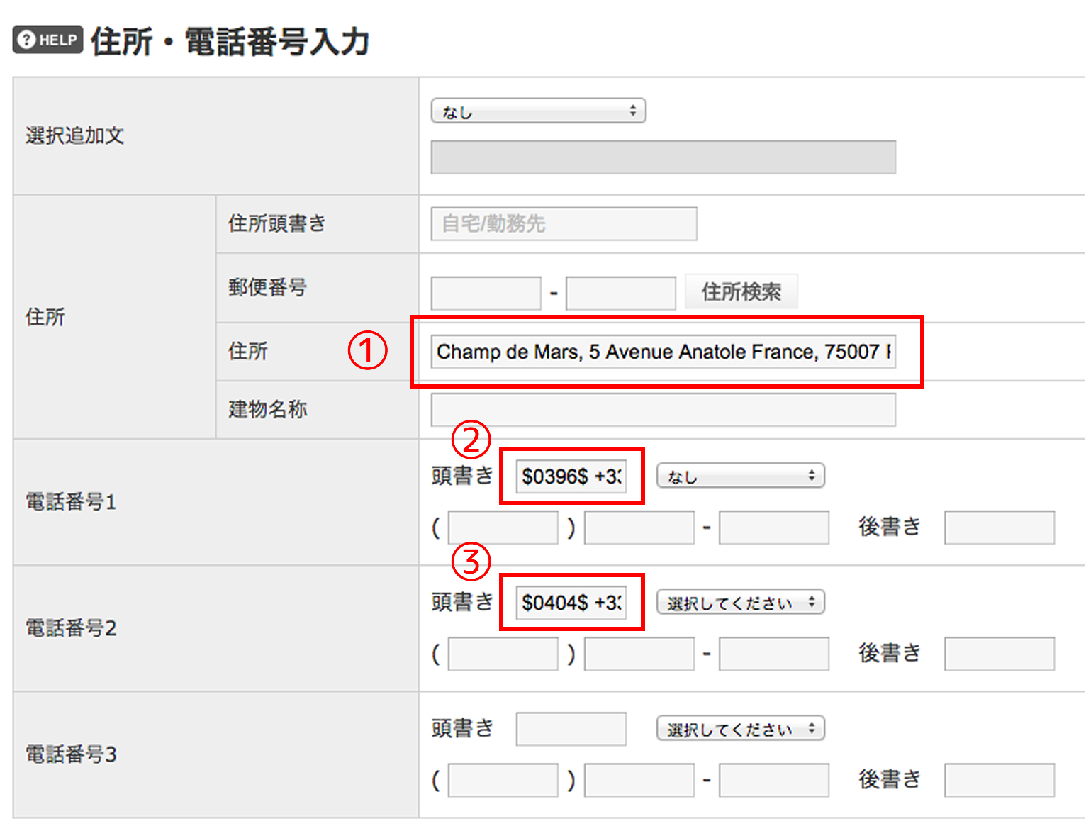 ②③の電話番号は、日本式のフォームでは入力できませんので、「頭書き」の入力フォームに全て入力します。